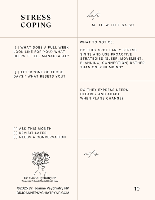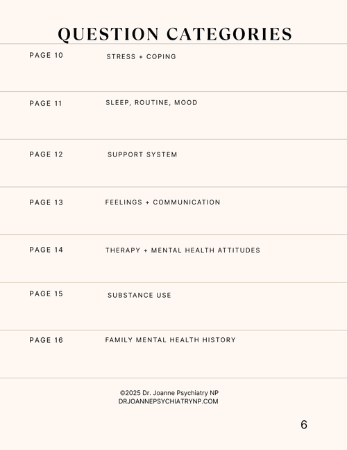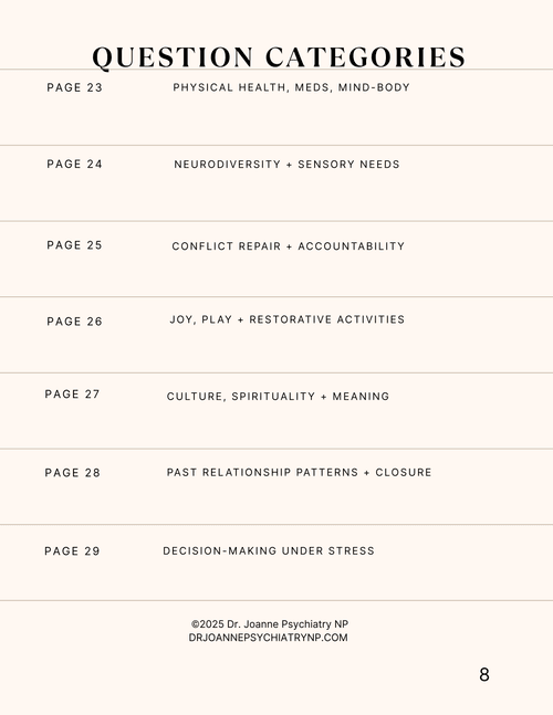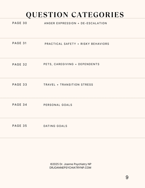 -Subtle prompts across stress, sleep, support, communication, substances, safety, consent, finances, family mental health patterns, work boundaries, and more.